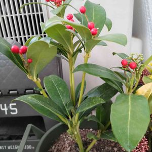 こんにちは~😊 スキミアの女のコ(雌株)です。 赤い実と蕾がいっしょに付いてます💕