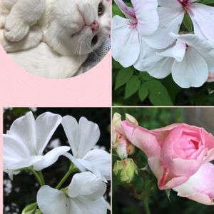 おはようございます😃☀ 今朝は、ピンク系シリーズで投稿しますね〜〜(╹◡╹)♡♡♡🎶 左上のゼラニウムさん、なんだか段々畑みたいに三段に咲いてるように見えます🤣 右下の夜来香の薔薇さん、今朝もステキな容姿と色合いです😍✨✨✨