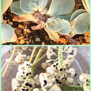 ✤雨のあとは要注意✤ おはょー(*´▽`)ノノ 今朝の庭パトにて見つけた根腐れ七福神 3センチくらいの子株が一昨日の雨で蒸れて 根腐れ起こしてバラバラになりました💦(T_T) 雨の後、気温があがると土の温度も上がるので 背丈の低い子株は非常に蒸れやすくなります 風通しってホントに大事なんですょね それと、南風の雨は塩分を含んでいます 塩害を避けるために次の水やりは頭から水をかけて 塩を流すようにする予定です💧 同じプランターの大きな親株達14コは みんな元気にしています(*^^*) よかったぁー👍🏻 そして、春に咲かせたムスカリの種が採れました💟 種まき育て、調べてみようと思います🗒