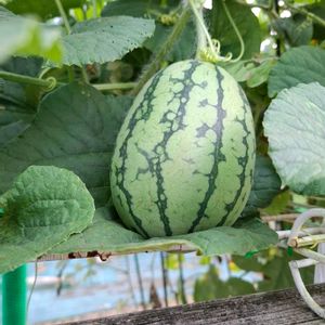 ベランダの小玉スイカ🍉 2日前に見つけた小さな実が着いていたのが、 今年初かと思っていたら、ずっと気が付かないで葉の茂みに隠れていた実が先にしっかりと成長していました😀
