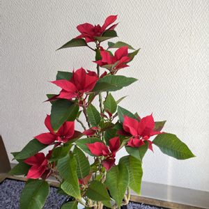 時期ハズレですが。。 一昨年のクリスマス🎄に頂いたポインセチア 短日処理が緩かったのでクリスマス時期には緑でしたが、 ここ最近真っ赤になってきました。 木質化してたくましい感じです😆