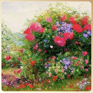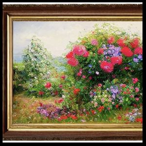 話題のお絵描きばりぐっどくAI が描いた絵です。 8K,高品質,写実的,油絵, Olga Wisinger-Florian,花の庭の風景画,木製額付きで絵の全体を描く オルガ・ヴィジンガー=フローリアン の新作