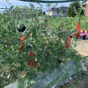 実生苗から育てたピノガールです。 立体栽培で育てています。 マスクを利用して受けにしていましたが昨日ネットを購入して取り付けました。
