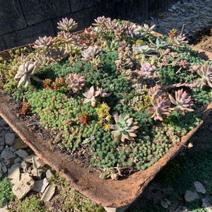 一年前に拾った一輪車の上の部分に普及種の多肉とセダムを植えてみました。薄くなっている部分に少しづつ再度、挿し芽していきたいです。