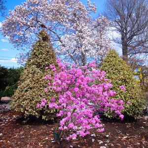 【1枚目】 前から、ツツジ、斑入りアオキのツインタワー、モクレンのコラボです🙌 青空と雲の背景も気に入りました🙌 【2・3枚目】 別の場所で咲き始めたツツジです🙌 【4・5枚目】 モクレンは終盤戦。地面には花びらが敷きつめられています😱 (農業試験場内にて)