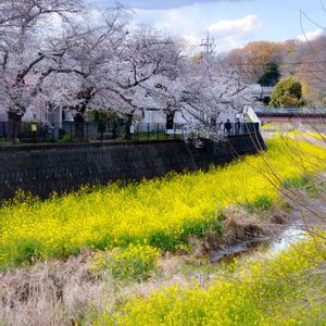 先日の雨で川の水も少し戻り、両岸の菜の花に桜も加わって、待っていた風景が完成しました🙌