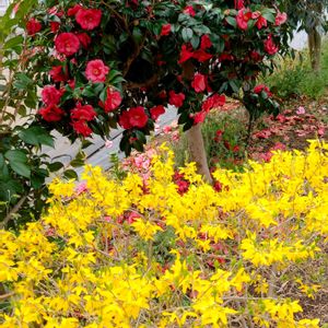 生け垣にしたら幸せになりそうですね🤩 いつもの散歩コースも、今日のテーマ「レンギョウ」が黄色い世界をつくり出していました🙌(農業試験場内にて)