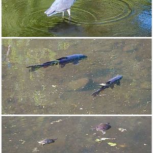 【番外編】 本日2枚目の投稿です📸 近所の川べりにて。強風のあとで、川面には葉っぱが散らばっています。 【上】ひさびさにアオサギくんと再会しましました🙌 【中】怪しい影が🫢 コイの親子か!? デカい〰👀😱 【下】カメ3匹がぷかぷか👀 デカい〰👀🫢