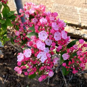 コンペイトウがいっぱいあります🧐🤭 ネームプレートがちょっとよごれていますね🤭 わたしの名前は「カルミア オスボ レッド」です🙇 よろしくネ🙋(農業試験場内にて)