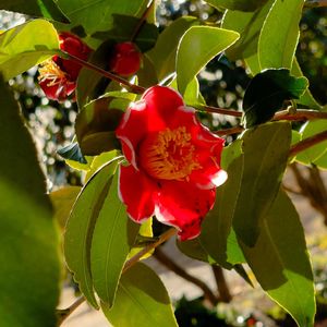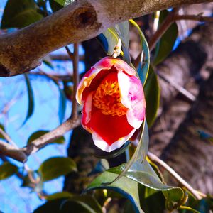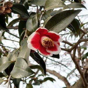 逆光でちょっと透かしツバキになっちゃいました☹️ まだ花数か少なくて、いい被写体がなかったのですが、花弁に白い縁取りがあるきれいなツバキ「タマノウラ」です😀(農業試験場内にて)