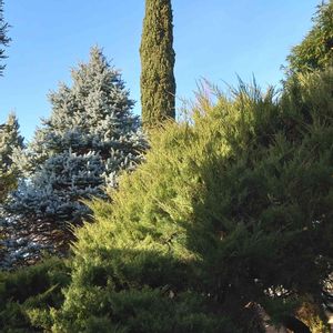 コロラドトウヒ(奥から2番目)の奥には、またまた登場のとんがったヤツ、ニョッキーです🤣 このフォトにお題をつけるとしたら「青天を衝け」でどうどしょうか😀 どこかで聞いたことがあるなぁ🤔 お許しを🤫🙏🙇💃 それにしてもとんがってるなぁ🤣(農業試験場内にて)