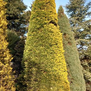 プレートにはイトスギ「ゴールデンクレスト」と表示されていました🧐 西日を浴びて金色に輝いていました✨ あっ、怪しい人影が! すんません🫢、撮影しているわたくしめです📸🫣