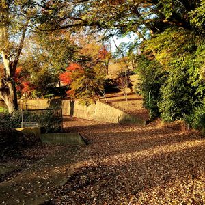 西日が差し込む落ち葉で敷きつめられた遊歩道🍁🍁🍁 未踏の新雪の上を歩くときのように、サクッサクッと気持ちのよい音がしました😀(近所の農業試験場内の遊歩道にて)