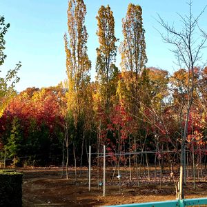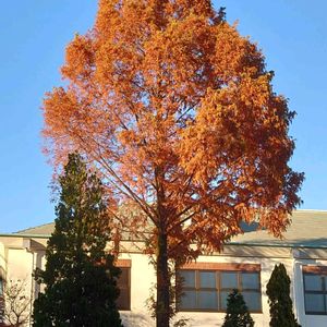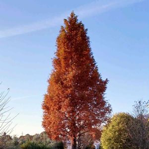 青空を背景にそびえ立つメタセコイア😮 青🟦と赤🍁の対比がきれいなので撮りました📸(農業関連施設にて)