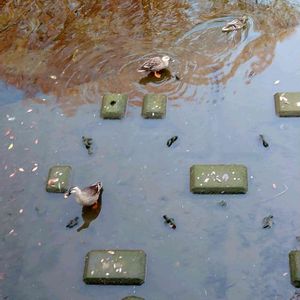 近くの川でカルガモのファミリーに遭遇しました🦆🦆🦆 オレンジ色の水かきあんよがかわいかったです🥰