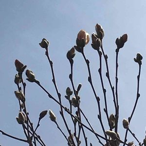 今日は朝からいい天気❣️😆 我が家のヒメコブシがピンク色になってきました💕 かなりズームしましたが、このスマホでは限界です😅 近々、ちゃんと咲いたのpicします😁🤣