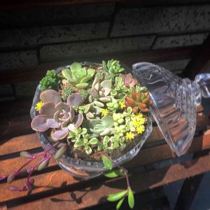 今日は、久しぶりに一日中日光浴ができそう♪ ガラスの器にちまちま寄せ植え。
