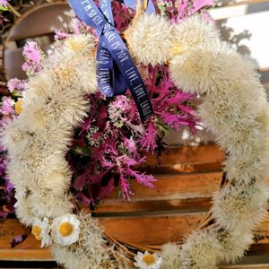 今日のお花🏷️のタンポポ。 画像が無い。去年作ったタンポポ綿毛のリース、葉牡丹リースと一緒にパチリ📱。 タンポポ綿毛1年経って、ちょっと色が濃くなった⁉️それでも、綿毛そのままキープって凄いなぁ😆(保存は⚠️台紙入れたマチ付きOPP袋に入れてます)。今年も、綿毛遊び楽しもう♪ ベランダで撮影、風が気になって•••🤣 (2025/3/12)
