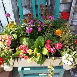 玄関脇の寄せ植えその1♥ 木の箱は、息子ご幼少のころ 愛用の積木入れをアイボリーに 塗ってリメイク( *´艸`) 今日は、ハンギングバスケット作るぞ⤴😌🌸💕