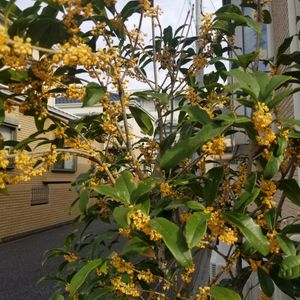 キンモクセイ 一昨年の9月29日(水)にお迎えしました 前回の投稿が昨年の10月17日(日) 今年も昨年もほとんど同じ時期に投稿している我が家のキンモクセイ✨ 今年もキンモクセイのいい香りがする季節がやって来たー✌️ 5日前の夕方にふっくらつやつや~の花芽を発見ー😃 今では黄色の蕾が開花準備におわれています🎵 この先はお花が咲くとオレンジ色になると思います🎵🤗 1つのお花が咲いている日数は短く3~7日ほどで散ってしまいます💦