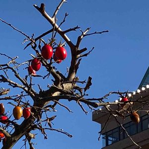 公園内にある二つの柿が長い間別の種類と思っていたのですが初めて今日同じものだと気付きました(^◇^;) 以前見たロウヤガキは表面に点々がある渋ーい茶色 今回のロウヤガキは艶々の赤なぜこんなにも違うのでしよか⁉️
