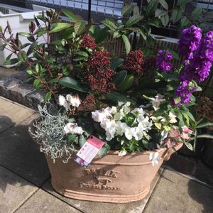 今日は義母の誕生日で花が好きみたいなので寄せ植えのプレゼントします♡ 後ろの葉っぱはうちの花壇のコバノズイナの木✧ ストックにスキミアにベロニカに初雪カズラにビオラにシクラメンにシルバーリーフはプラチナって名前だったと思います♪ 間違えてたらごめんない(´×ω×`) テラコッタ鉢かわいい♡