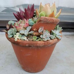 ここのところおサボりしてました😅 割れた鉢を重ねて2階建て寄せ植え作りました🎵 皆様の投稿拝見してて、作りたくてうずうずしていたんです❤ 葉挿し苗も入れてますよ〜❤