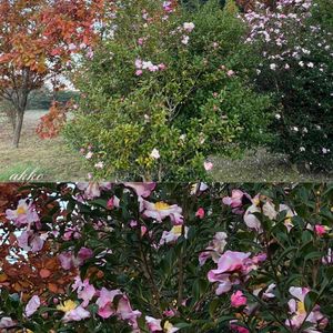 御殿場市の富士山ビューが素晴らしい場所の山茶花たち 6株植えられた大きな木、様々な表情と色合いの花びら ひみつのアッコの、素敵な秘密の場所になりそうです⁉️