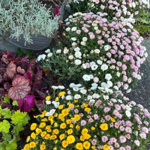 ジジガーデンマムの鉢植えを三鉢お迎えしました💕🫶 我が家の庭の入り口に、ヒューケラの前に並べました 菊花展もあちこちで開催され、秋たけなわですね🌼🌸 一鉢100円だったので、お持ち帰りしたんです‼️