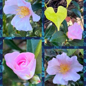 ビンクの一重の山茶花が裏庭の垣根で咲いてきました ヒラヒラの花びらが可愛くて、ハート型の蔦の葉に 絡まれていて、黄葉してきたハート型に隠れた蕾も、、