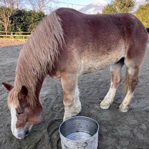 元競馬馬だった白馬ブリット君を訪ねて厩舎へ 外の広場では茶色の馬、鶏達や三ヶ月目の仔馬 乗馬体験やホースセラピーなどになってます❗