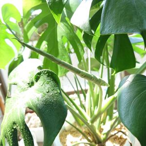 モンステラ様 日光浴中🌿 大きい鉢の場合、水やりのタイミングが難しくて よくわからないので、昨夜水分計を注文してみました… うまくいくといいなぁ…。 新芽の成長が早くて、ドキドキします🙄 早くみたいな💚