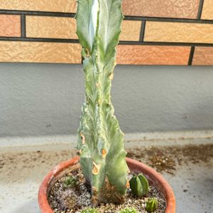 ユーフォルビア マハラジャ(ラクテア綴化) Euphorbia lactea f.cristata 昨年8月に台木から接ぎ降ろししたマハラジャが漸く動き出し、脇から子株が出現。 接ぎ降ろし時にカットして挿し木した二株も、葉が茂り出し順調に成長中。
