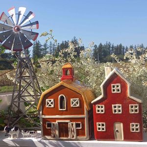 こんばんわପ(⑅ˊᵕˋ⑅)ଓ 今日から10月 早いですね〜 北海道も今年最後の真夏日 28℃ありました〜💦💦 今日は私のよく行く雑貨屋さんの セールの日 前々から狙っていた 風車と牛舎 赤いお家ゲットしました〜 牛舎とお家はランタンになっています♫ お天気だったので さっそく満開のナツユキカズラをバックに 縁チャンから頂いた 親子の🐮さんで📸 北海道らしい風景かな? makimayチャンの 🏷どたま祭りに参加しますモー🐮┳┓モー 10月も *゚ヨロシク オネガイシマス゚*(⁎ᵕᴗᵕ)⁾⁾