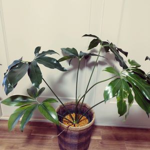 フィロデンドロンファンバンさん✨ 植え替え完了!! 7〜8寸のプラ鉢に植え替えして、上司に貰った藤カゴで窓辺においてます(•‿•) 葉を広げると結構なスペースをとるので、花紐で葉を括ってスペースをとらないようにしてます。 気根が一本出てますね