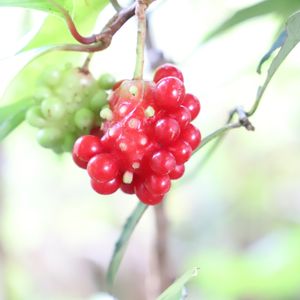 サネカズラ(実葛) マツブサ科サネカズラ属のつる性常緑低木 別名 ビナンカズラ(美男葛) 少し、光が射し込む程度の籔の中、ひと際、目立って、赤いつぶつぶの実をつけた球形の塊が、ひとつだけ、ぶら下がっていました。 和菓子に、こんな形のものがあったような…(’-’*)♪ 美味しそうに見えて、無味無臭で、味気ないそうですが、12月になると、わずかに甘くなるそうです。 小鳥たちの食べ物になるのかな~(^-^)