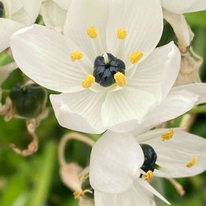 前投稿のアメリカフウロの隣で咲いていました。 何という花でしょうか? 熟した実が見たかったけど、この後刈られてしまいました💧 💚💚💚💚 オーニソガラム アラビカムと教えていただきました。和名は、黒星大甘菜(クロボシオオアマナ)。 和名のように、黒い雌しべが目立って黄色の雄しべと白い花びらに映えますね💗 先日もオーニソガラム コーダツムを教えていただいたばかり。 種類が違うと花のつき方や様子が違って、同じオーニソガラムとは思いませんでした。