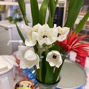 真ん中が翡翠のような濃い光ったグリーン(雄しべ?)タマノレンの花びらより幅広。茎はタマノレンや水仙と同じで葉っぱと別。