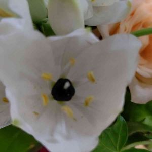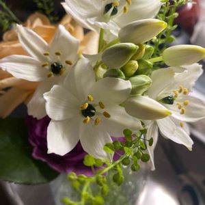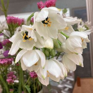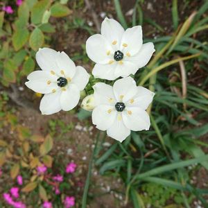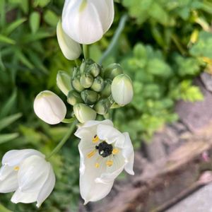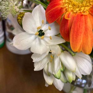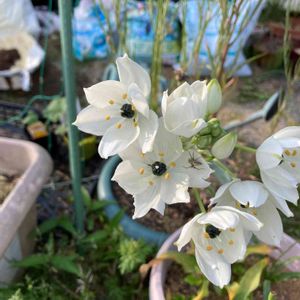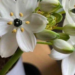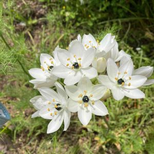 買い物に出かけた先で母が見つけた花。 花が大好きは母が初めて見たという花。 花の名前をGoogleで検索してみました。 オーニソガラム・アラビカム 白い花びらの真ん中にツヤツヤに光る黒い玉が美しいです。