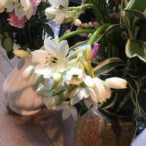 「ダンディ邸の庭に咲くこの白い花🌼》 たくさん咲いていて綺麗なので切花にしてダンディ流に生けてみました(笑)🤣💕 オーニソガラムかなぁ⁈ 「君の名は」