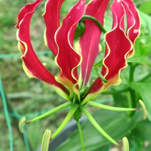 庭のグロリオサ❗ 昨年の秋、鉢植えのグロリオサ、根を掘りあげるのを忘れ絶滅したと思っていましたが、春に鉢を整理しようとしたら、見たことのある芽が.,.😄 大事に育てました🎶😄
