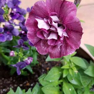 ペチュニア寄せ植え。 ペチュニアはアンティークっぽい色が可愛くて買ってきました。摘心したのでいっぱい咲いてくれますように。