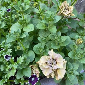 🍃ꕤ*。゚寄せ植えꕤ*。゚🍃 💙💜 チーム・ブルー ㊗️ Mr.マーさん4000picおめでとうございます🎉 今期初めてのペチュニア、ジュリエットさんです。 寄せてから2週間程ですが、こんなにお花がたくさん付きました🎶 モーブ色?アンティーク感のあるパープルピンクです💜 色褪せてもきれいなペチュニアさんです✨ 主役なのでリーフだけ… 🌿ウエストリンギア スモーキー 🌿ヘデラ・グレーシャー