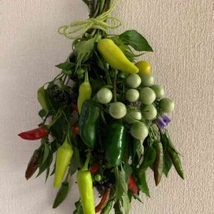 野菜スワッグ 畑で採れた野菜達 とうがらし ミニトマト ハックルベリー 紫ホウズキ ツルムラサキの実 綿の花…など どうかしら?