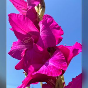 こんにちは😃 庭先にグラジオラスの花が咲きました🌸 花言葉は「密会」「用心深い」 濃いピンク色で青空の中爽やかに 咲いていました🩷🌱🌸