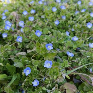 大犬の陰嚢(オオイヌノフグリ) オオバコ科クワガタソウ属の2年草。1884年に東京上野で牧野富太郎により発見された地中海沿岸原産の帰化植物。日当たりのよい空き地や道端などに生える。茎は根元から枝分かれして地面を這うように伸び、絨毯を敷いたように広がる。青紫色の花が散りばめられたようにたくさん咲く。花期は春だが、12~2月の厳冬期に咲くことも珍しくない。朝開き夕方閉じる一日花で、他家受粉しない場合は花が閉じる時に自家受粉する。 蜜蜂やハナアブなどが蜜を求めて訪れるが、花柄が細いためハナアブの重みで花が傾いてしまう。ハナアブは滑り落ちないように雄しべにしがみつきもがく。すると、花粉を出している2つの葯に挟まれて花粉がつくため、花粉は確実に運ばれる。 在来種のイヌノフグリに似ていて、それより大きいのが名の由来。イヌノフグリは果実の形が犬の陰嚢に似ているのが名の由来。 出典『色と形で見わけ散歩を楽しむ花図鑑』『里山さんぽ植物図鑑』