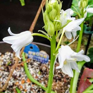 球根つりがねそう🌸 タグ🏷には次から次へと花が.... ピンク、紫、白の3株が植えてあるはず。 連れてきた時にはすでに🌿が3つ出ていた。 次から次へとと書いてあるものの咲いたのは紫 白このたった2輪のみ ピンクはどこ〜 花芽も出てこない😂😂 今年は無理かな➰