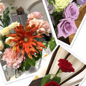 又わけありのお花を頂きました💐 オレンジの炎の様な花はガーベラで🌼 赤のビロードの様なバラは レッドエレガンスだそうです🌹