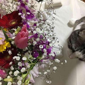 実は昨日誕生日でした🎉🎊🎂 なんと雅子様と同じ誕生日なんてビックリですよね😆 1日遅れで花束頂きました💕 早速可愛い🐱顔が… チェックしに来ましたよ〜🤪❤️
