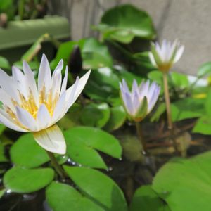 今朝は熱帯スイレン三種(手前からウィリアムマクレーン、サイアムレッド、ティナ)四輪、揃って初日の花を咲かせてくれた。